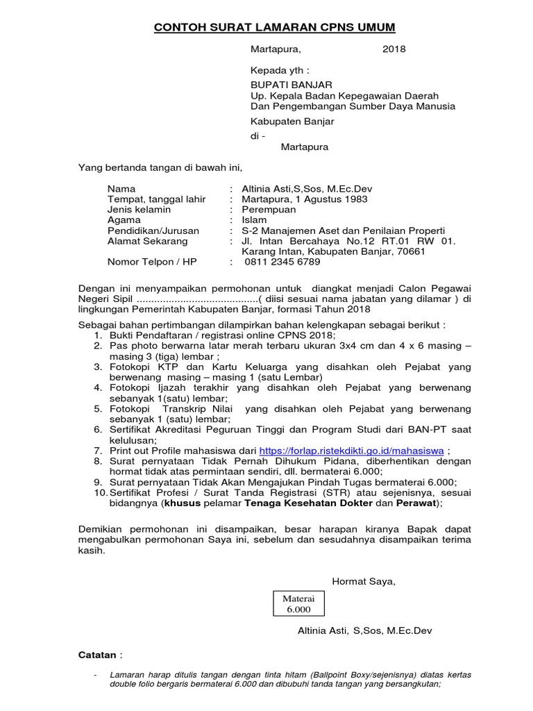 Contoh surat lamaran cpns 2019. Contoh surat lamaran kerja cpns. Contoh surat lamaran cpns ini kami tulis sebagai bahan rujukan bagi kamu yang sedang mempersiapkan diri untuk mengikuti seleksi masuk sebagai pegawai negeri sipil (cpns). Diatas adalah sebuah contoh surat lamaran pekerjaan yang ditulis tangan. Dengan hormat, berhubungan dengan informasi lowongan kerja pada pt mitra pasifik medan yang dimuat pada koran waspada pada 13 april 2018. Usahakan tulis surat lamaran kerjamu dengan semenarik mungkin. Surat lamaran ditulis tangan sendiri dengan tinta hitam, dibubuhi materai rp. Surat lamaran tersebut selanjutnya diunggah melalui laman resmi penerimaan cpns. Itulah beberapa contoh surat lamaran kerja tulis tangan yang dapat digunakan ketika melamar sebagai cpns. Contoh surat lamaran kerja tulis tangan. Pastikan surat lamaran ini ditulis dengan rapi dan dapat dibaca dengan jelas sehingga peluang untuk diterima perusahaan atau instansi pun semakin besar. Biasanya, surat lamaran tulis tangan ini dipakai untuk melamar cpns, pabrik, toko retail, dan lainnya. Dengan ini menyampaikan surat lamaran untuk dapat menjadi calon pegawai negeri sipil di lingkungan kementerian pendidikan dan kebudayaan tahun 2019.